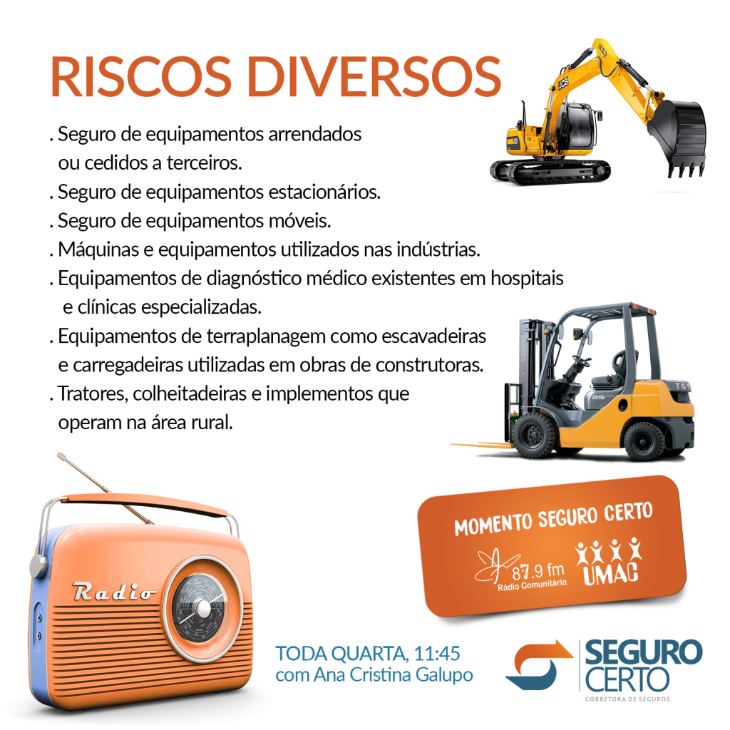 O Seguro de Riscos Diversos – Equipamentos é destinado à proteção do patrimônio de pessoas físicas e jurídicas, com garantia do pagamento de indenizações por danos causados aos seus equipamentos decorrentes de acidente de causa externa, inclusive o roubo e o furto qualificado.